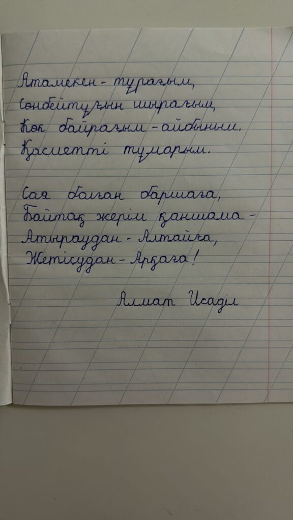 Алымжан Алишер Рустамұлы. Көркем жазу Түркістан облысы,Созақ ауданы,Созақ ауылы, “Науайы” атындағы жалпы білім беретін мектептің 2-“Ә” сынып оқушысы Алымжан Алишер Рустамұлы Сынып жетекшісі:Әметова Лаура Байұзаққызы FacebookTwitterPinterestWhatsApp Басқа қатысушылар 2-СЫНЫП ОҚУШЫЛАРЫ АРАСЫНДАҒЫ «КӨРКЕМ ЖАЗУ» БАЙҚАУЫ ЕРКІН ЖАРҚЫРА ТҰРЛАНҚЫЗЫ. Көркем жазу 0 2-СЫНЫП ОҚУШЫЛАРЫ АРАСЫНДАҒЫ «КӨРКЕМ ЖАЗУ» БАЙҚАУЫ Тұрсынхан Гауhартас Нұржанқызы. Көркем жазу 0 2-СЫНЫП ОҚУШЫЛАРЫ АРАСЫНДАҒЫ «КӨРКЕМ ЖАЗУ» БАЙҚАУЫ Жауымбай Мерейлім. Көркем жазу 0 2-СЫНЫП ОҚУШЫЛАРЫ АРАСЫНДАҒЫ «КӨРКЕМ ЖАЗУ» БАЙҚАУЫ Дүйсенғали Қарақат . Көркем жазу 0 2-СЫНЫП ОҚУШЫЛАРЫ АРАСЫНДАҒЫ «КӨРКЕМ ЖАЗУ» БАЙҚАУЫ Айтғали Айсұлтан. Көркем жазу 0