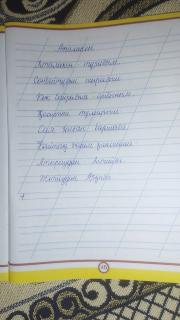 Дүйсенбай Жансая Дауренқызы. Көркем жазу "Жамбыл атындағы жалпы білім беретін мектеп" КММ нің 2 а сынып оқушысы Дүйсенбай Жансая Дауренқызы FacebookTwitterPinterestWhatsApp Басқа қатысушылар 2-СЫНЫП ОҚУШЫЛАРЫ АРАСЫНДАҒЫ «КӨРКЕМ ЖАЗУ» БАЙҚАУЫ Ерлан Айша Ақарысқызы. Көркем жазу 0 2-СЫНЫП ОҚУШЫЛАРЫ АРАСЫНДАҒЫ «КӨРКЕМ ЖАЗУ» БАЙҚАУЫ Кеңесбек Алихан Алмасұлы. Көркем жазу 0 «ҮЗДІК МАҚАЛА» БАЙҚАУЫ Аймаханова Зағипа Асқарқызы 0 2-СЫНЫП ОҚУШЫЛАРЫ АРАСЫНДАҒЫ «КӨРКЕМ ЖАЗУ» БАЙҚАУЫ Бауыржан Асыл Нуркенұлы. Көркем жазу 0 2-СЫНЫП ОҚУШЫЛАРЫ АРАСЫНДАҒЫ «КӨРКЕМ ЖАЗУ» БАЙҚАУЫ Марат Айару Альбертқызы. Көркем жазу 0