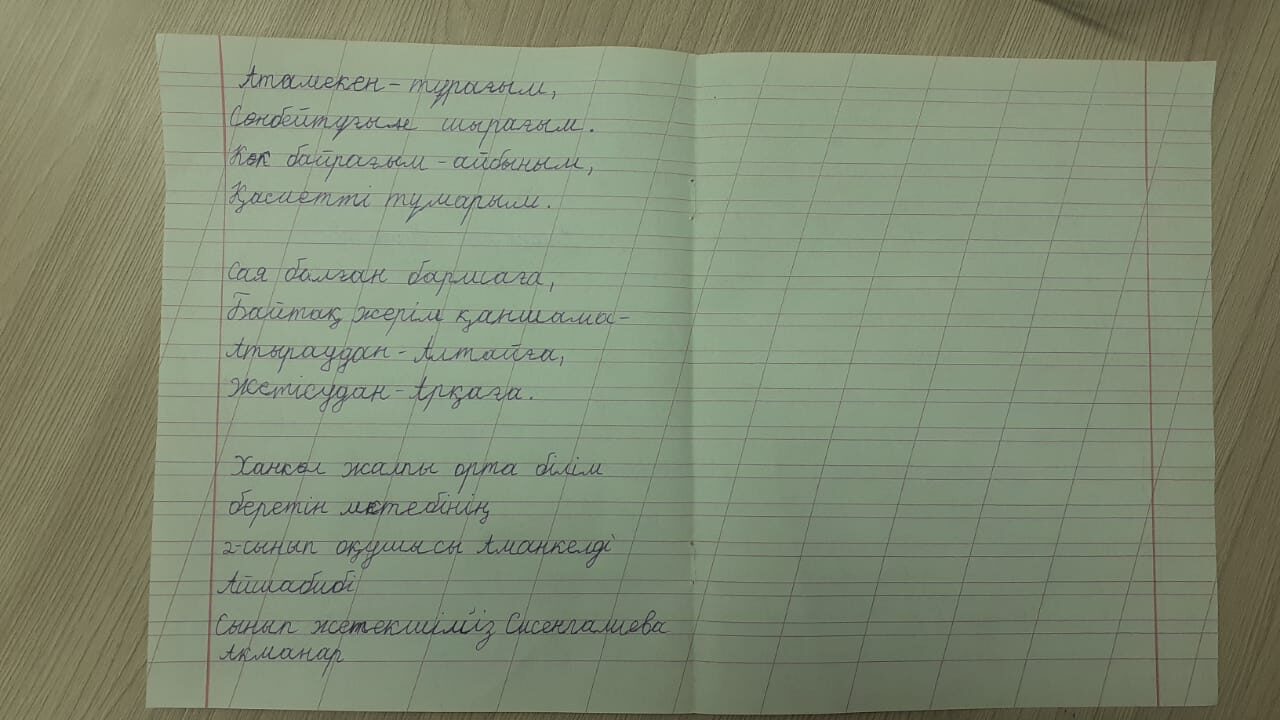Аманкелді Айшабибі. Көркем жазу БҚО, Қаратөбе ауданы, Ханкөл мектебі. Ханкөл ЖОББМ. 2-сынып оқушысы Аманкелді Айшабибі FacebookTwitterPinterestWhatsApp Басқа қатысушылар 2-СЫНЫП ОҚУШЫЛАРЫ АРАСЫНДАҒЫ «КӨРКЕМ ЖАЗУ» БАЙҚАУЫ ЕРКІН ЖАРҚЫРА ТҰРЛАНҚЫЗЫ. Көркем жазу 0 2-СЫНЫП ОҚУШЫЛАРЫ АРАСЫНДАҒЫ «КӨРКЕМ ЖАЗУ» БАЙҚАУЫ Тұрсынхан Гауhартас Нұржанқызы. Көркем жазу 0 2-СЫНЫП ОҚУШЫЛАРЫ АРАСЫНДАҒЫ «КӨРКЕМ ЖАЗУ» БАЙҚАУЫ Жауымбай Мерейлім. Көркем жазу 0 2-СЫНЫП ОҚУШЫЛАРЫ АРАСЫНДАҒЫ «КӨРКЕМ ЖАЗУ» БАЙҚАУЫ Дүйсенғали Қарақат . Көркем жазу 0 2-СЫНЫП ОҚУШЫЛАРЫ АРАСЫНДАҒЫ «КӨРКЕМ ЖАЗУ» БАЙҚАУЫ Айтғали Айсұлтан. Көркем жазу 0