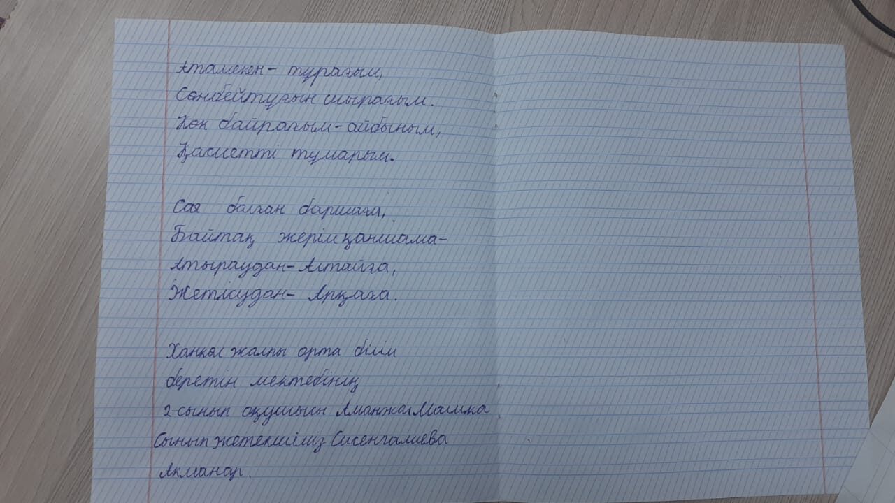 Аманжол Мәлика. Көркем жазу БҚО, Қаратөбе ауданы, Ханкөл мектебі. Ханкөл ЖОББМ. 2-сынып оқушысы Аманжол Мәлика FacebookTwitterPinterestWhatsApp Басқа қатысушылар 2-СЫНЫП ОҚУШЫЛАРЫ АРАСЫНДАҒЫ «КӨРКЕМ ЖАЗУ» БАЙҚАУЫ ЕРКІН ЖАРҚЫРА ТҰРЛАНҚЫЗЫ. Көркем жазу 0 2-СЫНЫП ОҚУШЫЛАРЫ АРАСЫНДАҒЫ «КӨРКЕМ ЖАЗУ» БАЙҚАУЫ Тұрсынхан Гауhартас Нұржанқызы. Көркем жазу 0 2-СЫНЫП ОҚУШЫЛАРЫ АРАСЫНДАҒЫ «КӨРКЕМ ЖАЗУ» БАЙҚАУЫ Жауымбай Мерейлім. Көркем жазу 0 2-СЫНЫП ОҚУШЫЛАРЫ АРАСЫНДАҒЫ «КӨРКЕМ ЖАЗУ» БАЙҚАУЫ Дүйсенғали Қарақат . Көркем жазу 0 2-СЫНЫП ОҚУШЫЛАРЫ АРАСЫНДАҒЫ «КӨРКЕМ ЖАЗУ» БАЙҚАУЫ Айтғали Айсұлтан. Көркем жазу 0