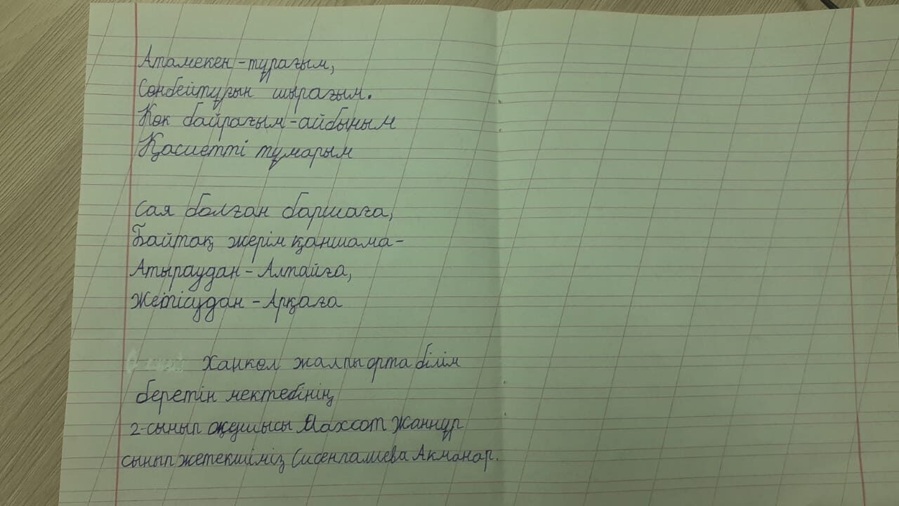 Махсот Жаннұр. Көркем жазу БҚО, Қаратөбе ауданы, Ханкөл мектебі. Ханкөл ЖОББМ. 2-сынып оқушысы Махсот Жаннұр FacebookTwitterPinterestWhatsApp Басқа қатысушылар 2-СЫНЫП ОҚУШЫЛАРЫ АРАСЫНДАҒЫ «КӨРКЕМ ЖАЗУ» БАЙҚАУЫ ЕРКІН ЖАРҚЫРА ТҰРЛАНҚЫЗЫ. Көркем жазу 0 2-СЫНЫП ОҚУШЫЛАРЫ АРАСЫНДАҒЫ «КӨРКЕМ ЖАЗУ» БАЙҚАУЫ Тұрсынхан Гауhартас Нұржанқызы. Көркем жазу 0 2-СЫНЫП ОҚУШЫЛАРЫ АРАСЫНДАҒЫ «КӨРКЕМ ЖАЗУ» БАЙҚАУЫ Жауымбай Мерейлім. Көркем жазу 0 2-СЫНЫП ОҚУШЫЛАРЫ АРАСЫНДАҒЫ «КӨРКЕМ ЖАЗУ» БАЙҚАУЫ Дүйсенғали Қарақат . Көркем жазу 0 2-СЫНЫП ОҚУШЫЛАРЫ АРАСЫНДАҒЫ «КӨРКЕМ ЖАЗУ» БАЙҚАУЫ Айтғали Айсұлтан. Көркем жазу 0