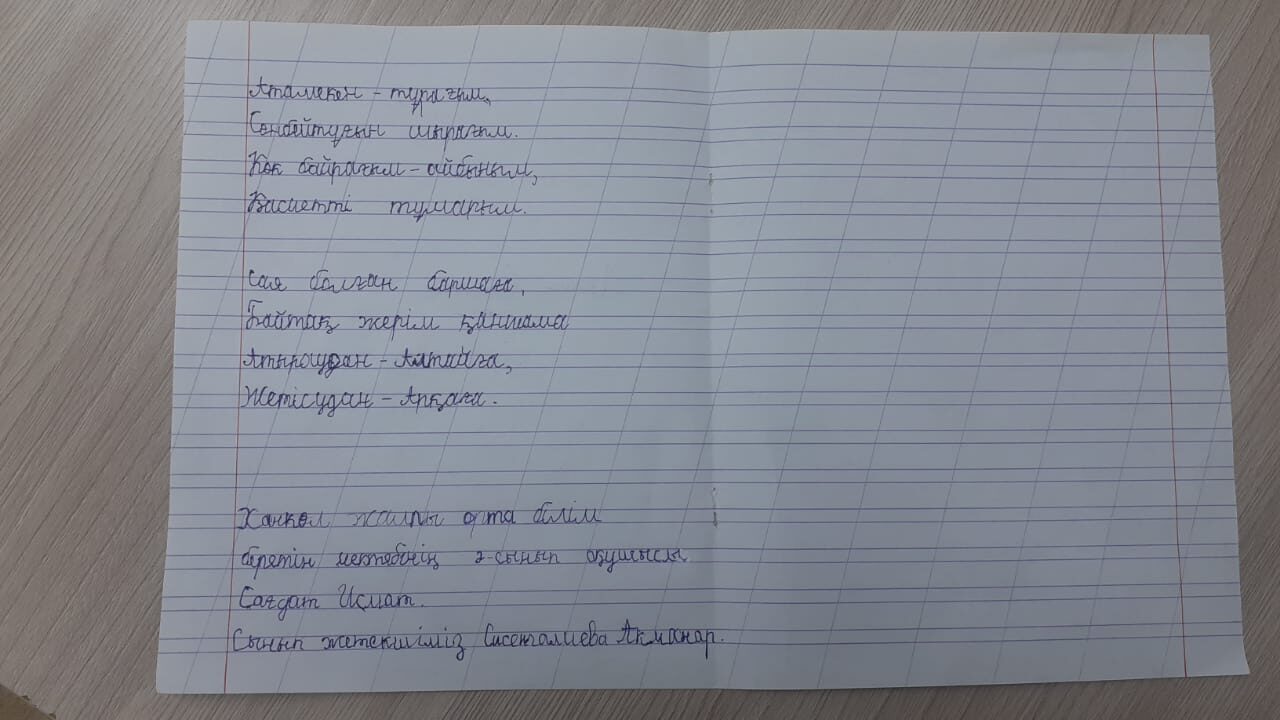 Сағдат Исмат. Көркем жазу БҚО, Қаратөбе ауданы, Ханкөл мектебі. Ханкөл ЖОББМ. 2-сынып оқушысы Сағдат Исмат FacebookTwitterPinterestWhatsApp Басқа қатысушылар 2-СЫНЫП ОҚУШЫЛАРЫ АРАСЫНДАҒЫ «КӨРКЕМ ЖАЗУ» БАЙҚАУЫ ЕРКІН ЖАРҚЫРА ТҰРЛАНҚЫЗЫ. Көркем жазу 0 2-СЫНЫП ОҚУШЫЛАРЫ АРАСЫНДАҒЫ «КӨРКЕМ ЖАЗУ» БАЙҚАУЫ Тұрсынхан Гауhартас Нұржанқызы. Көркем жазу 0 2-СЫНЫП ОҚУШЫЛАРЫ АРАСЫНДАҒЫ «КӨРКЕМ ЖАЗУ» БАЙҚАУЫ Жауымбай Мерейлім. Көркем жазу 0 2-СЫНЫП ОҚУШЫЛАРЫ АРАСЫНДАҒЫ «КӨРКЕМ ЖАЗУ» БАЙҚАУЫ Дүйсенғали Қарақат . Көркем жазу 0 2-СЫНЫП ОҚУШЫЛАРЫ АРАСЫНДАҒЫ «КӨРКЕМ ЖАЗУ» БАЙҚАУЫ Айтғали Айсұлтан. Көркем жазу 0
