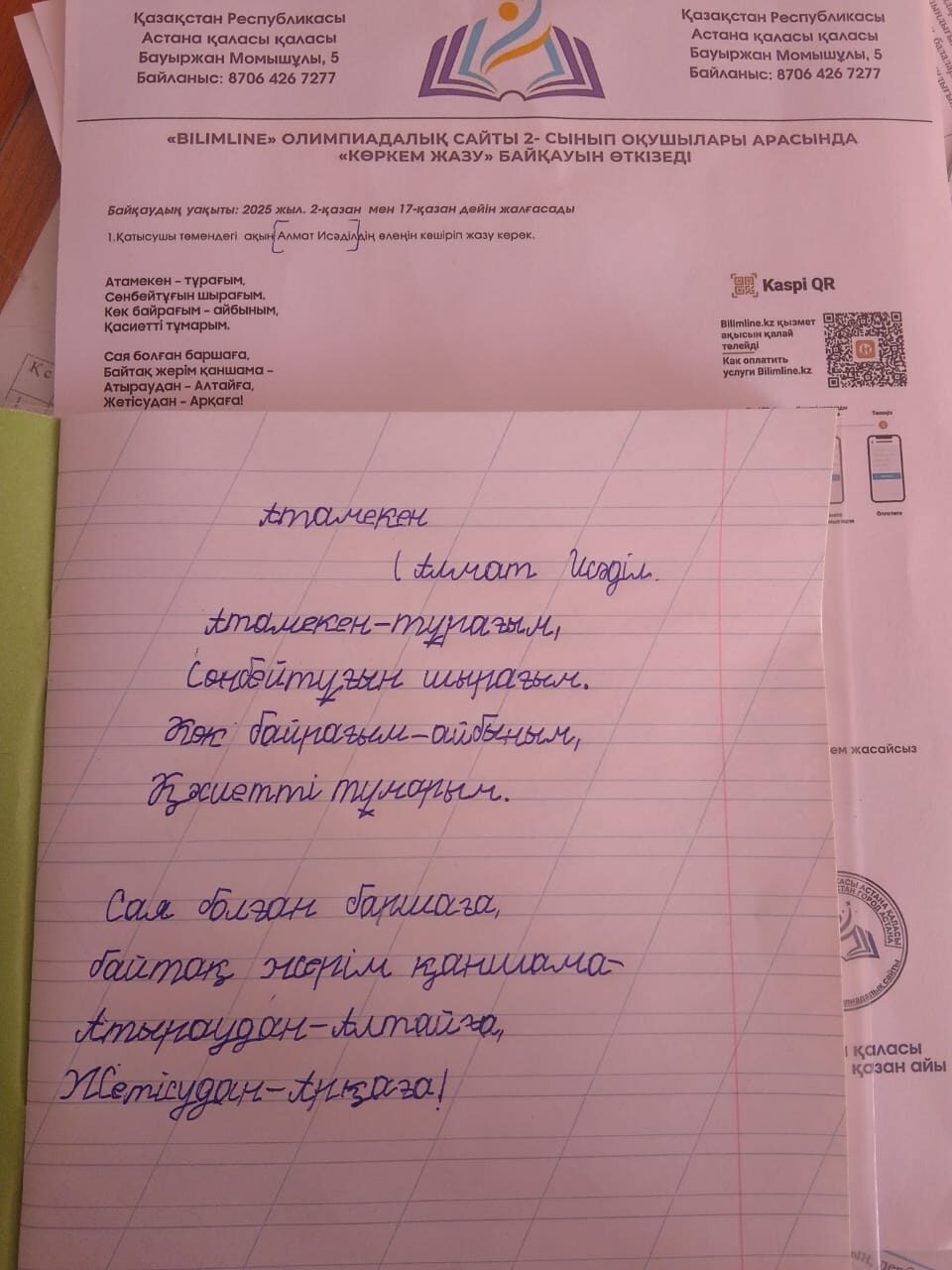 Серікбай Ерасыл Біржанұлы. Көркем жазу Түркістан облысы, Созақ ауданы, Шу ауылы "Ж. Қаламбаев атындағы шағын жинақты жалпы білім беретін мектеп" 2-сынып оқушысы Серікбай Ерасыл Біржанұлы Жетекшісі:Кенешбаева Гулдана FacebookTwitterPinterestWhatsApp Басқа қатысушылар «ҮЗДІК МАҚАЛА» БАЙҚАУЫ Ажибекова Гулшат Айтбаевна 0 2-СЫНЫП ОҚУШЫЛАРЫ АРАСЫНДАҒЫ «КӨРКЕМ ЖАЗУ» БАЙҚАУЫ Орынтай Айару. Көркем жазу 0 2-СЫНЫП ОҚУШЫЛАРЫ АРАСЫНДАҒЫ «КӨРКЕМ ЖАЗУ» БАЙҚАУЫ Әсілхан Алиар Әсетұлы. Көркем жазу 0 «ҮЗДІК МАҚАЛА» БАЙҚАУЫ Тойлыбай Назым Сайфудинқызы 0 2-СЫНЫП ОҚУШЫЛАРЫ АРАСЫНДАҒЫ «КӨРКЕМ ЖАЗУ» БАЙҚАУЫ Нұркен Дінмұхамед. Көркем жазу 0