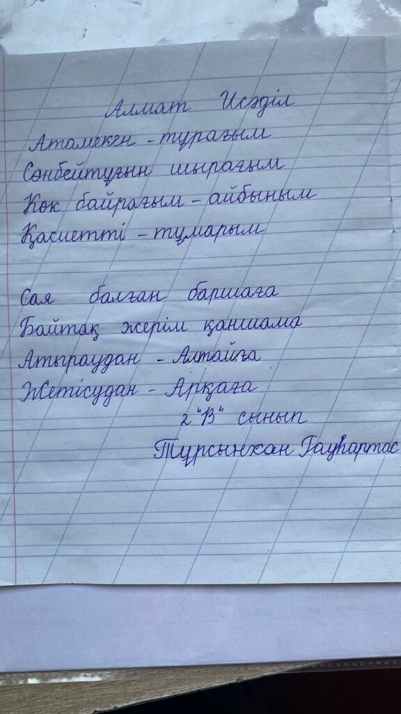 Тұрсынхан Гауhартас Нұржанқызы. Көркем жазу Оқушы:Тұрсынхан Гауhартас Нұржанқызы Жетекшісі:Хужамқулова Нилуфар Абдихалиққызы FacebookTwitterPinterestWhatsApp Басқа қатысушылар 2-СЫНЫП ОҚУШЫЛАРЫ АРАСЫНДАҒЫ «КӨРКЕМ ЖАЗУ» БАЙҚАУЫ ЕРКІН ЖАРҚЫРА ТҰРЛАНҚЫЗЫ. Көркем жазу 0 2-СЫНЫП ОҚУШЫЛАРЫ АРАСЫНДАҒЫ «КӨРКЕМ ЖАЗУ» БАЙҚАУЫ Жауымбай Мерейлім. Көркем жазу 0 2-СЫНЫП ОҚУШЫЛАРЫ АРАСЫНДАҒЫ «КӨРКЕМ ЖАЗУ» БАЙҚАУЫ Дүйсенғали Қарақат . Көркем жазу 0 2-СЫНЫП ОҚУШЫЛАРЫ АРАСЫНДАҒЫ «КӨРКЕМ ЖАЗУ» БАЙҚАУЫ Айтғали Айсұлтан. Көркем жазу 0 2-СЫНЫП ОҚУШЫЛАРЫ АРАСЫНДАҒЫ «КӨРКЕМ ЖАЗУ» БАЙҚАУЫ Жанғожаұлы Ислам. Көркем жазу 0