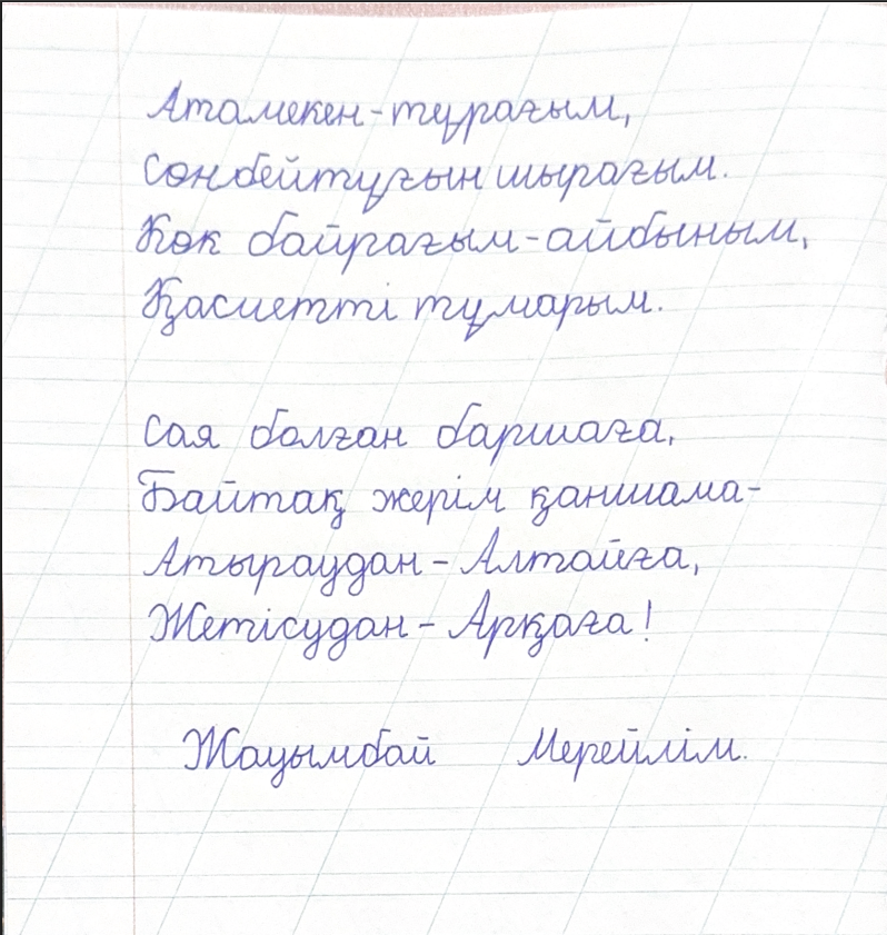 Жауымбай Мерейлім. Көркем жазу FacebookTwitterPinterestWhatsApp Басқа қатысушылар 2-СЫНЫП ОҚУШЫЛАРЫ АРАСЫНДАҒЫ «КӨРКЕМ ЖАЗУ» БАЙҚАУЫ ЕРКІН ЖАРҚЫРА ТҰРЛАНҚЫЗЫ. Көркем жазу 0 2-СЫНЫП ОҚУШЫЛАРЫ АРАСЫНДАҒЫ «КӨРКЕМ ЖАЗУ» БАЙҚАУЫ Тұрсынхан Гауhартас Нұржанқызы. Көркем жазу 0 2-СЫНЫП ОҚУШЫЛАРЫ АРАСЫНДАҒЫ «КӨРКЕМ ЖАЗУ» БАЙҚАУЫ Дүйсенғали Қарақат . Көркем жазу 0 2-СЫНЫП ОҚУШЫЛАРЫ АРАСЫНДАҒЫ «КӨРКЕМ ЖАЗУ» БАЙҚАУЫ Айтғали Айсұлтан. Көркем жазу 0 2-СЫНЫП ОҚУШЫЛАРЫ АРАСЫНДАҒЫ «КӨРКЕМ ЖАЗУ» БАЙҚАУЫ Жанғожаұлы Ислам. Көркем жазу 0