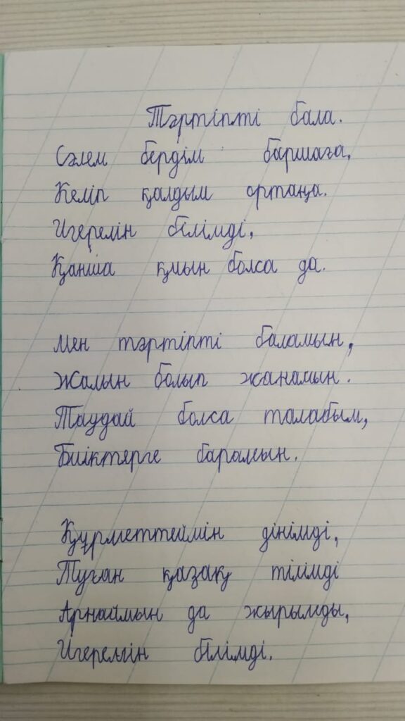 Эгамова Фарзона Тахировна. Көркем жазу Сынып жетекшісі: Привалиева Айнур Кыдыровна FacebookTwitterPinterestWhatsApp Басқа қатысушылар МАД тобы мен 1-сынып оқушылары арасында Республикалық «көркем жазу» байқауы Абжан Айсұлтан. Көркем жазу 0 МАД тобы мен 1-сынып оқушылары арасында Республикалық «көркем жазу» байқауы Сундеткалиева Ясмина Мирасовна. Көркем жазу 0 МАД тобы мен 1-сынып оқушылары арасында Республикалық «көркем жазу» байқауы Николаенко Артём Сергеевич. Көркем жазу 0 МАД тобы мен 1-сынып оқушылары арасында Республикалық «көркем жазу» байқауы Дүйсенбай Айдарбек Қанатұлы. Көркем жазу 0 МАД тобы мен 1-сынып оқушылары арасында Республикалық «көркем жазу» байқауы Барат Жібек. Көркем жазу 0