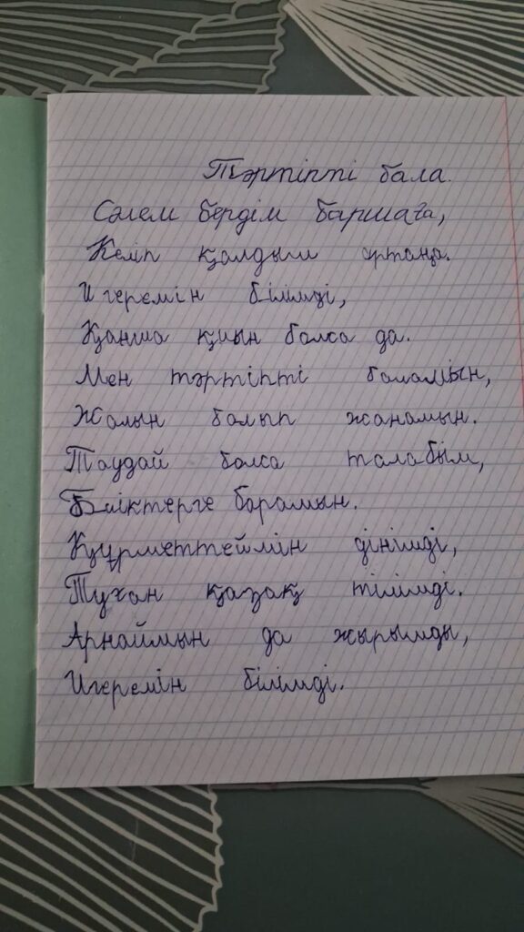 Тилеген Нұрлыбек. Көркем жазу FacebookTwitterPinterestWhatsApp Басқа қатысушылар МАД тобы мен 1-сынып оқушылары арасында Республикалық «көркем жазу» байқауы Сундеткалиева Ясмина Мирасовна. Көркем жазу 0 МАД тобы мен 1-сынып оқушылары арасында Республикалық «көркем жазу» байқауы Николаенко Артём Сергеевич. Көркем жазу 0 МАД тобы мен 1-сынып оқушылары арасында Республикалық «көркем жазу» байқауы Дүйсенбай Айдарбек Қанатұлы. Көркем жазу 0 МАД тобы мен 1-сынып оқушылары арасында Республикалық «көркем жазу» байқауы Барат Жібек. Көркем жазу 0 МАД тобы мен 1-сынып оқушылары арасында Республикалық «көркем жазу» байқауы Тілеген Нұрмұхаммед. Көркем жазу 0