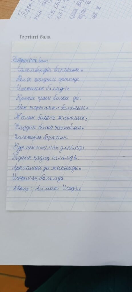 Ерёмин Илиан. Көркем жазу 1-сынып оқушысы Ерёмин Илиан БҚО, Бәйтерек ауданы Переметный ЖОББМ Жетекшісі: Жазыкбаева Гулжиһан Жонысовна FacebookTwitterPinterestWhatsApp Басқа қатысушылар «ҮЗДІК МАҚАЛА» БАЙҚАУЫ Назаров Ербол Сарханович 0 «ҮЗДІК МАҚАЛА» БАЙҚАУЫ Мухамедов Шайхидин Абдураимович 0 «ҮЗДІК МАҚАЛА» БАЙҚАУЫ Закирова Манзура Дауреновна 0 ЕРКІН ТАҚЫРЫПТА «ЭССЕ» ЖАЗУ БАЙҚАУЫ Куанышова Аийда Талғатқызы 0 ЕРКІН ТАҚЫРЫПТА «ЭССЕ» ЖАЗУ БАЙҚАУЫ Мухамедов Шайхидин Абдураимович 0