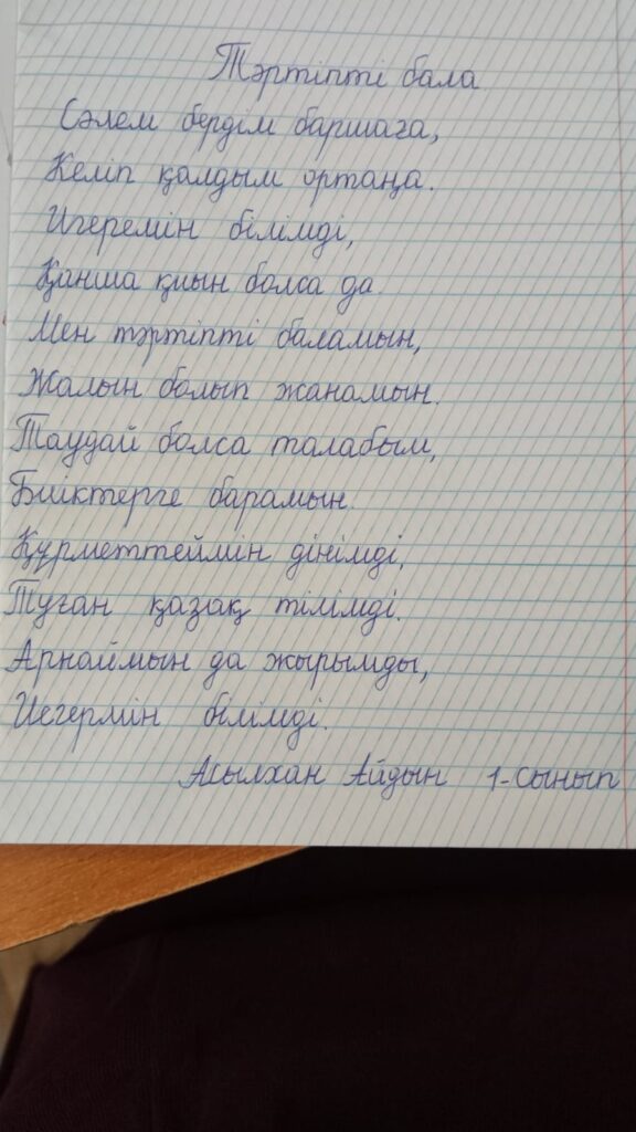 Асылхан Айдын. Көркем жазу Асылхан Айдын "Үшсарт ауылының негізгі орта мектебі"КММ Жетекшісі:Туганбаева Сабира Кабыкеновна FacebookTwitterPinterestWhatsApp Басқа қатысушылар МАД тобы мен 1-сынып оқушылары арасында Республикалық «көркем жазу» байқауы Қанат Ханшайым. Көркем жазу 0 МАД тобы мен 1-сынып оқушылары арасында Республикалық «көркем жазу» байқауы Мұрат Ханбибі. Көркем жазу 0 МАД тобы мен 1-сынып оқушылары арасында Республикалық «көркем жазу» байқауы Жанәділқызы Сафия. Көркем жазу 0 МАД тобы мен 1-сынып оқушылары арасында Республикалық «көркем жазу» байқауы Асильбек Бақдәулет. Көркем жазу 0 МАД тобы мен 1-сынып оқушылары арасында Республикалық «көркем жазу» байқауы Айтуарова Жасмин Маратовна. Көркем жазу 0