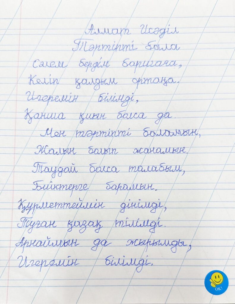 Ислам Айбат Азаматұлы. Көркем жазу Жетекшісі: Кадиргалиева Ансаган Есенамановна FacebookTwitterPinterestWhatsApp Басқа қатысушылар МАД тобы мен 1-сынып оқушылары арасында Республикалық «көркем жазу» байқауы Қанат Ханшайым. Көркем жазу 0 МАД тобы мен 1-сынып оқушылары арасында Республикалық «көркем жазу» байқауы Мұрат Ханбибі. Көркем жазу 0 МАД тобы мен 1-сынып оқушылары арасында Республикалық «көркем жазу» байқауы Жанәділқызы Сафия. Көркем жазу 0 МАД тобы мен 1-сынып оқушылары арасында Республикалық «көркем жазу» байқауы Асильбек Бақдәулет. Көркем жазу 0 МАД тобы мен 1-сынып оқушылары арасында Республикалық «көркем жазу» байқауы Айтуарова Жасмин Маратовна. Көркем жазу 0