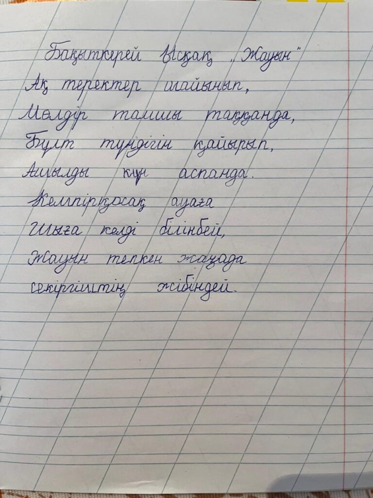 Рымжан Рамазан.Көркем жазу Семей қаласы 21 "жалпы орта білім беретін мектеп"КММ 2 "Ә" сынып Рымжан Рамазан 7 жаста Сынып жетекшісі: Сайлаубаева Анаргул Ербаевна FacebookTwitterPinterestWhatsApp Басқа қатысушылар 2-сынып оқушылары арасында Республикалық «көркем жазу» байқауы Қосылқан Жансезім Асетқызы. Көркем жазу 0 2-сынып оқушылары арасында Республикалық «көркем жазу» байқауы Алибекұлы Мұхаммед. Көркем жазу 0 2-сынып оқушылары арасында Республикалық «көркем жазу» байқауы Салихар Алина Русланқызы. Көркем жазу 0 2-сынып оқушылары арасында Республикалық «көркем жазу» байқауы Төлеуғазин Мансур Ришатұлы. Көркем жазу 0 2-сынып оқушылары арасында Республикалық «көркем жазу» байқауы Шермурат Ұлдана Алибекқызы. Көркем жазу 0