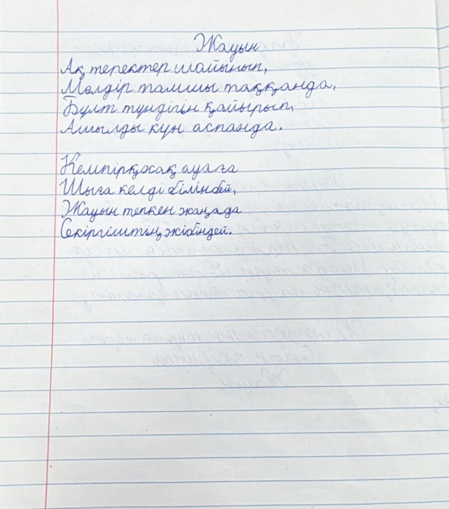 Қабдуәли Еркежан. Көркем жазу Павлодар облысы Баянауыл ауданы Ж.Аймауытов атындағы жалпы орта білім беру мектебінің 2-сынып оқушысы Қабдуәли Еркежан. Жетекшісі: Бапишева Ерсингуль Даулетбаевна FacebookTwitterPinterestWhatsApp Басқа қатысушылар 2-сынып оқушылары арасында Республикалық «көркем жазу» байқауы Қосылқан Жансезім Асетқызы. Көркем жазу 0 2-сынып оқушылары арасында Республикалық «көркем жазу» байқауы Алибекұлы Мұхаммед. Көркем жазу 0 2-сынып оқушылары арасында Республикалық «көркем жазу» байқауы Салихар Алина Русланқызы. Көркем жазу 0 2-сынып оқушылары арасында Республикалық «көркем жазу» байқауы Төлеуғазин Мансур Ришатұлы. Көркем жазу 0 2-сынып оқушылары арасында Республикалық «көркем жазу» байқауы Шермурат Ұлдана Алибекқызы. Көркем жазу 0