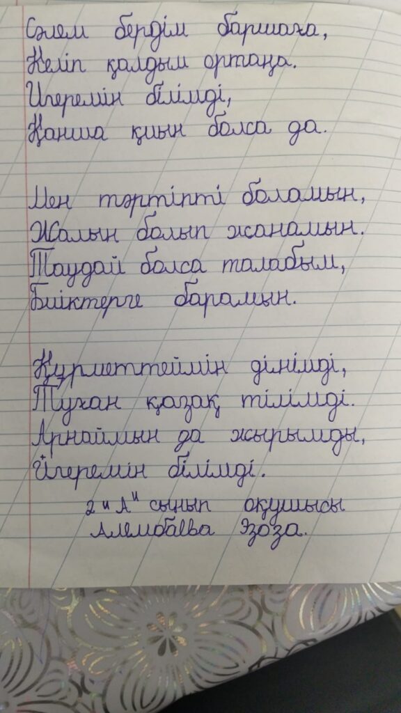 Алембаева Эзоза. Көркем жазу Мұғалімі: Кобенова Гулшат Зеилбековна FacebookTwitterPinterestWhatsApp Басқа қатысушылар 2-сынып оқушылары арасында Республикалық «көркем жазу» байқауы Жұмахан Раяна. Көркем жазу 0 2-сынып оқушылары арасында Республикалық «көркем жазу» байқауы Махмурова Муниса. Көркем жазу 0 2-сынып оқушылары арасында Республикалық «көркем жазу» байқауы Мирзаева Гүлсанам. Көркем жазу 0 2-сынып оқушылары арасында Республикалық «көркем жазу» байқауы Рудик Кристина. Көркем жазу 0 2-сынып оқушылары арасында Республикалық «көркем жазу» байқауы Батырбек Бекайым. Көркем жазу 0