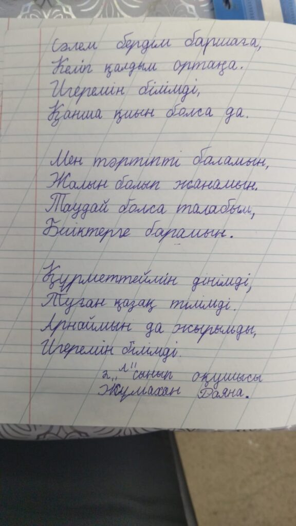 Жұмахан Раяна. Көркем жазу Мұғалімі: Кобенова Гулшат Зеилбековна FacebookTwitterPinterestWhatsApp Басқа қатысушылар 2-сынып оқушылары арасында Республикалық «көркем жазу» байқауы Махмурова Муниса. Көркем жазу 0 2-сынып оқушылары арасында Республикалық «көркем жазу» байқауы Мирзаева Гүлсанам. Көркем жазу 0 2-сынып оқушылары арасында Республикалық «көркем жазу» байқауы Алембаева Эзоза. Көркем жазу 0 2-сынып оқушылары арасында Республикалық «көркем жазу» байқауы Рудик Кристина. Көркем жазу 0 2-сынып оқушылары арасында Республикалық «көркем жазу» байқауы Батырбек Бекайым. Көркем жазу 0