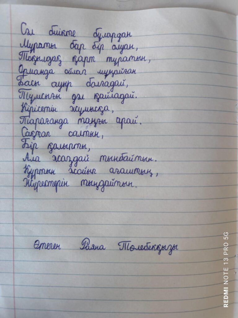 Өтеген Раяна Төлебекқызы. Көркем жазу Алматы облысы Қарасай ауданы "Ахмет Байтұрсынұлы атындағы орта мектебі" кмм Жетекшісі: Сыдыкова Жанат Комекбаевна FacebookTwitterPinterestWhatsApp Басқа қатысушылар 3-сынып оқушылары арасында Республикалық «көркем жазу» байқауы Умирбай Айлин Болатқызы. Көркем жазу 0 3-сынып оқушылары арасында Республикалық «көркем жазу» байқауы Китжан Ұлжан Жаңабайқызы. Көркем жазу 0 3-сынып оқушылары арасында Республикалық «көркем жазу» байқауы Утебаев Алихан Жамбулович. Көркем жазу 0 «ҮЗДІК МАҚАЛА» БАЙҚАУЫ Ермурзаева Айнура Шералиевна 0 3-сынып оқушылары арасында Республикалық «көркем жазу» байқауы Құттыбай Айзере Аманжолқызы. Көркем жазу 0