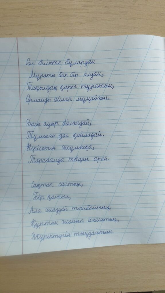 Дүйсен Арай Нұржауқызы. Көркем жазу Әліби Жангелдин атындағы номері 27 жалпы білім беретін мектеп FacebookTwitterPinterestWhatsApp Басқа қатысушылар 3-сынып оқушылары арасында Республикалық «көркем жазу» байқауы Бекболат Гауһар Сапаралықызы. Көркем жазу 0 3-сынып оқушылары арасында Республикалық «көркем жазу» байқауы Мусурманова Дияра Анваровна. Көркем жазу 0 3-сынып оқушылары арасында Республикалық «көркем жазу» байқауы Есенбек Арман Бекболұлы. Көркем жазу 0 3-сынып оқушылары арасында Республикалық «көркем жазу» байқауы Ережеп Нуриман Сапарбайұлы. Көркем жазу 0 3-сынып оқушылары арасында Республикалық «көркем жазу» байқауы Қуантай Төреғали Серікұлы. Көркем жазу 0