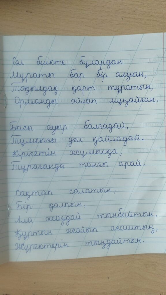 Мусурманова Элнура Зоировна. Көркем жазу Ә. Жангелдин атындағы номері 27 жалпы білім беретін мектептің бастауыш сынып жетекшісі Тулиева Шахсанам Назаркуловна FacebookTwitterPinterestWhatsApp Басқа қатысушылар 3-сынып оқушылары арасында Республикалық «көркем жазу» байқауы Бекболат Гауһар Сапаралықызы. Көркем жазу 0 3-сынып оқушылары арасында Республикалық «көркем жазу» байқауы Мусурманова Дияра Анваровна. Көркем жазу 0 3-сынып оқушылары арасында Республикалық «көркем жазу» байқауы Есенбек Арман Бекболұлы. Көркем жазу 0 3-сынып оқушылары арасында Республикалық «көркем жазу» байқауы Ережеп Нуриман Сапарбайұлы. Көркем жазу 0 3-сынып оқушылары арасында Республикалық «көркем жазу» байқауы Қуантай Төреғали Серікұлы. Көркем жазу 0