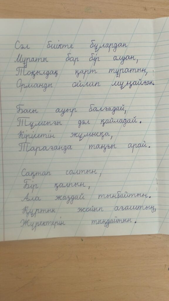 Жалғасбай Нұржамал Талғатқызы. Көркем жазу Әліби Жангелдин атындағы номері 27 жалпы білім беретін мектеп FacebookTwitterPinterestWhatsApp Басқа қатысушылар 3-сынып оқушылары арасында Республикалық «көркем жазу» байқауы Бекболат Гауһар Сапаралықызы. Көркем жазу 0 3-сынып оқушылары арасында Республикалық «көркем жазу» байқауы Мусурманова Дияра Анваровна. Көркем жазу 0 3-сынып оқушылары арасында Республикалық «көркем жазу» байқауы Есенбек Арман Бекболұлы. Көркем жазу 0 3-сынып оқушылары арасында Республикалық «көркем жазу» байқауы Ережеп Нуриман Сапарбайұлы. Көркем жазу 0 3-сынып оқушылары арасында Республикалық «көркем жазу» байқауы Қуантай Төреғали Серікұлы. Көркем жазу 0