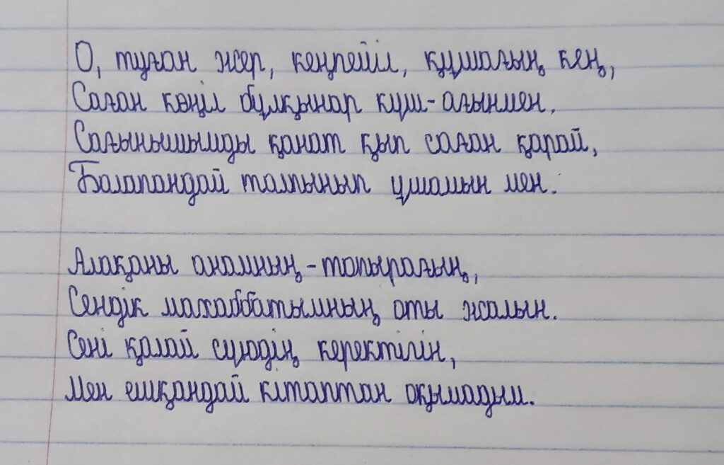 Көркем жазу. Әмірқұл Раяна FacebookTwitterPinterestWhatsApp Басқа қатысушылар 4-сынып оқушылары арасында Республикалық «көркем жазу» байқауы Оразалы Рамазан Нұржанұлы. Көркем жазу 0 4-сынып оқушылары арасында Республикалық «көркем жазу» байқауы Нұрланұлы Азамат. Көркем жазу 0 4-сынып оқушылары арасында Республикалық «көркем жазу» байқауы Дүйсенбай Айзере Алмасқызы. Көркем жазу 0 ЕРКІН ТАҚЫРЫПТА «ЭССЕ» ЖАЗУ БАЙҚАУЫ Тастемирова Акмарал Гиниятовна 0 ЕРКІН ТАҚЫРЫПТА «ЭССЕ» ЖАЗУ БАЙҚАУЫ Ажибиева Рима Токбазаровна 0