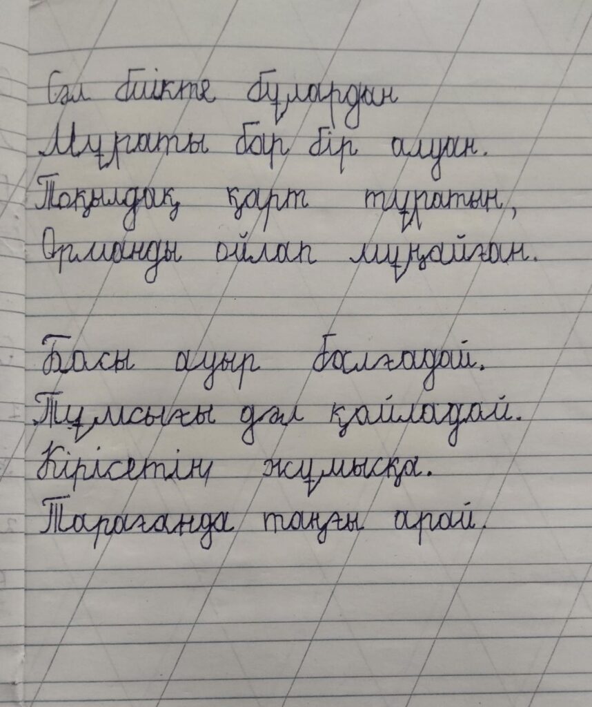 Сейтжан Сәлима. Көркем жазу Түркістан облысы Кентау қаласы Шортанбай Қанайұлы атындағы ✓2 жалпы білім беретін мектеп Жетекші: Рахметова Мөлдір FacebookTwitterPinterestWhatsApp Басқа қатысушылар 4-сынып оқушылары арасында Республикалық «көркем жазу» байқауы Торлан Әлия. Көркем жазу 0 4-сынып оқушылары арасында Республикалық «көркем жазу» байқауы Балтабай Аянат. Көркем жазу 0 4-сынып оқушылары арасында Республикалық «көркем жазу» байқауы Сәрсенбай Еркежан. Көркем жазу 0 4-сынып оқушылары арасында Республикалық «көркем жазу» байқауы Бектөре Айша. Көркем жазу 0 4-сынып оқушылары арасында Республикалық «көркем жазу» байқауы Юсупова Айша. Көркем жазу 0
