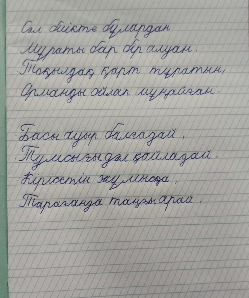 Торлан Әлия. Көркем жазу Түркістан облысы Кентау қаласы Шортанбай Қанайұлы атындағы ✓2 жалпы білім беретін мектеп Жетекші: Рахметова Мөлдір FacebookTwitterPinterestWhatsApp Басқа қатысушылар 4-сынып оқушылары арасында Республикалық «көркем жазу» байқауы Балтабай Аянат. Көркем жазу 0 4-сынып оқушылары арасында Республикалық «көркем жазу» байқауы Сәрсенбай Еркежан. Көркем жазу 0 4-сынып оқушылары арасында Республикалық «көркем жазу» байқауы Бектөре Айша. Көркем жазу 0 4-сынып оқушылары арасында Республикалық «көркем жазу» байқауы Юсупова Айша. Көркем жазу 0 4-сынып оқушылары арасында Республикалық «көркем жазу» байқауы Құрбанғали Асылжан. Көркем жазу 0